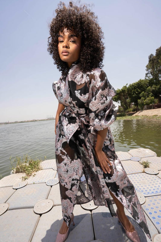 Baheya Silver Kaftan in Luxurious Brocade Organza