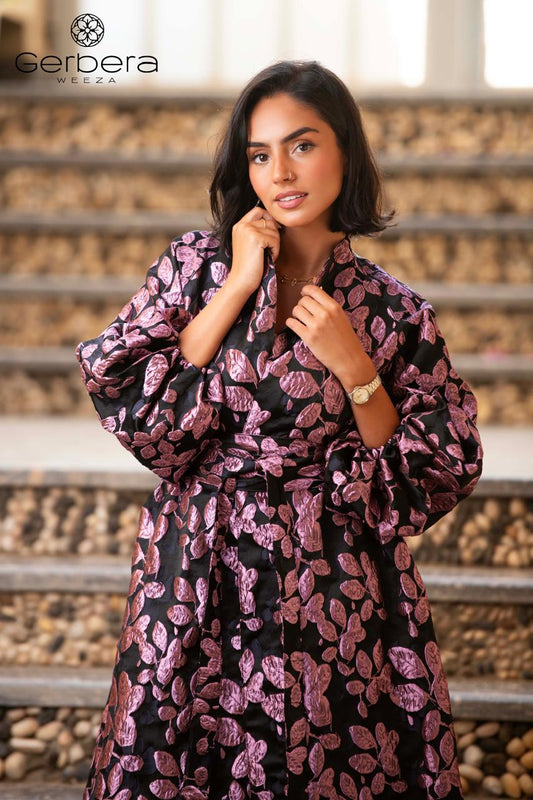 Baheya Blue-in-Black Kaftan in Brocade Organza