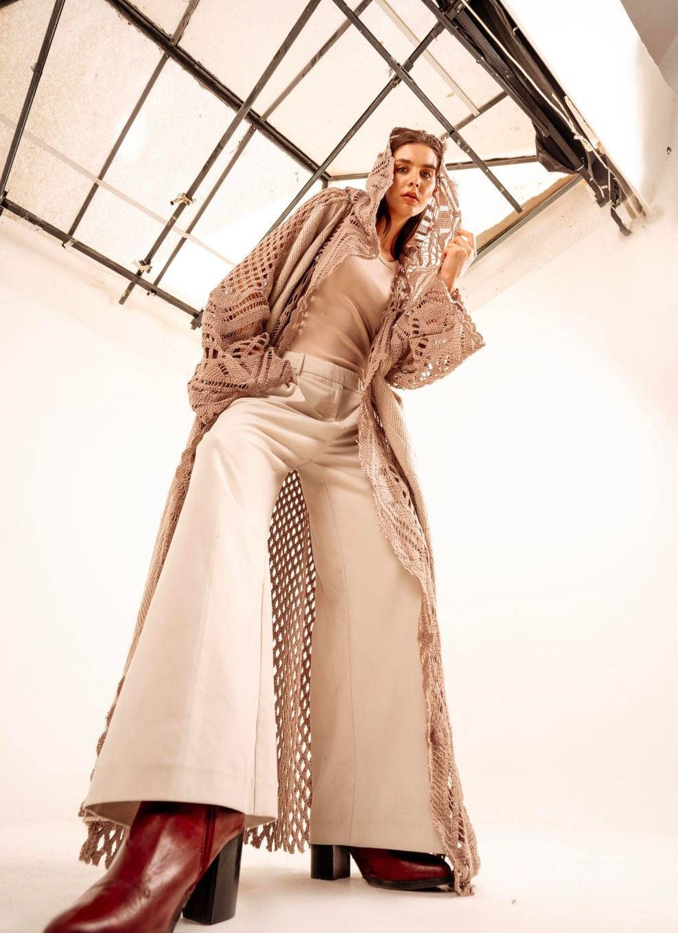 Crochet cardigan crafted from premium wool with distinctive handmade crochet detailing.